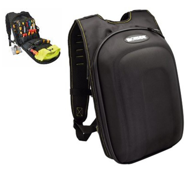 20 L (Tamaño compatible con escalera de aro de seguridad Tejido impermeable de nailonbalístico duradero 1680D Resistencia al agua Cremalleras de alta resistencia con sellado de goma Bolsillo trasero para PC Asa de agarre rápido Carga máxima 10kg. Bolsillos y correas para hasta 35 herramientas) Herramientas no incluidas